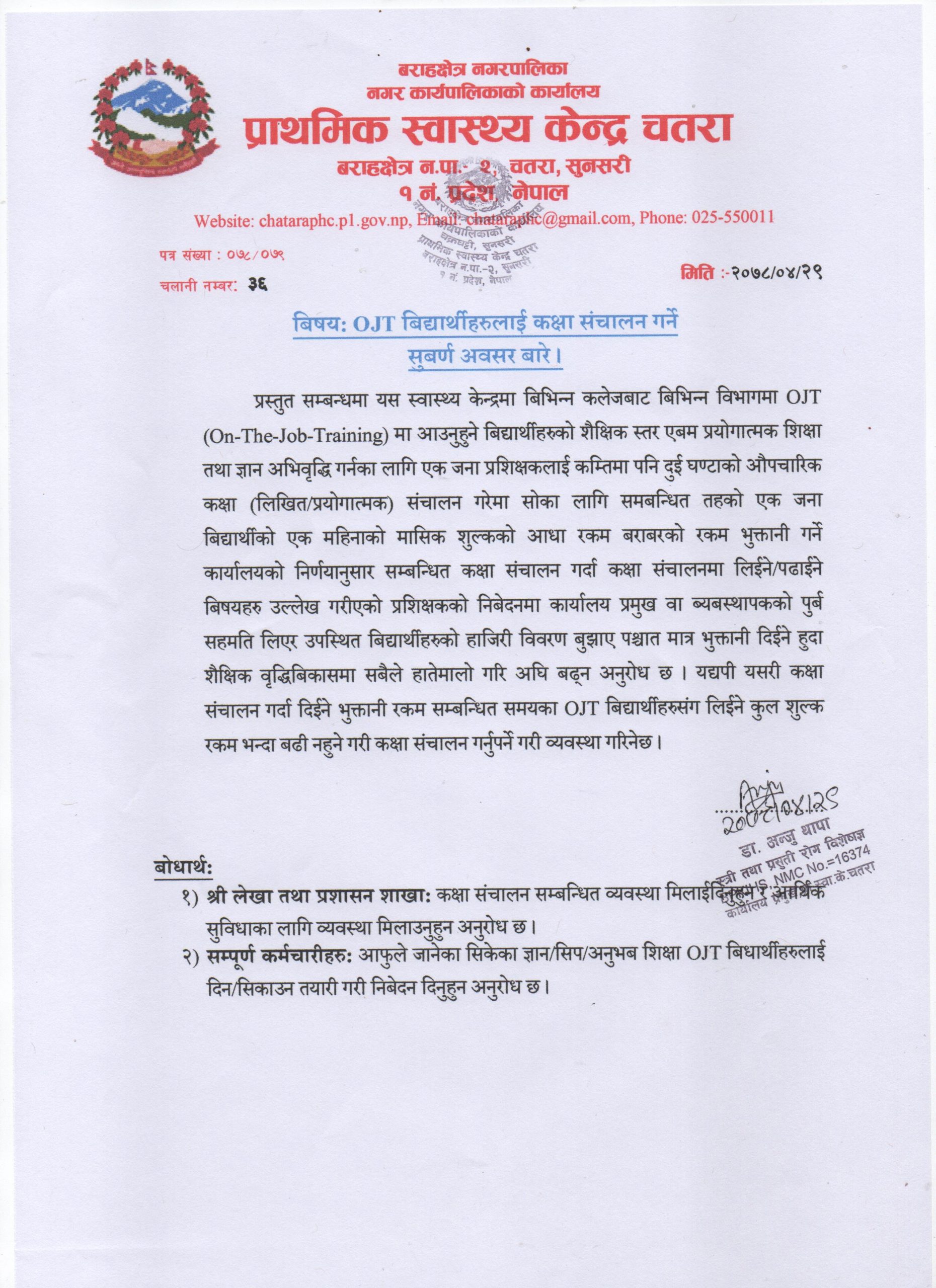 प्रस्तुत सम्बन्धमा यस स्वास्थ्य केन्द्रमा बिभिन्न कलेजबाट बिभिन्न विभागमा OJT (On-The-Job-Training) मा आउनुहुने बिद्यार्थीहरुको शैक्षिक स्तर एबम प्रयोगात्मक शिक्षा तथा ज्ञान अभिवृद्धि गर्नका लागि एक जना प्रशिक्षकलाई कम्तिमा पनि दुई घण्टाको औपचारिक कक्षा (लिखित/प्रयोगात्मक) संचालन गरेमा सोका लागि समबन्धित तहको एक जना बिद्यार्थीको एक महिनाको मासिक शुल्कको आधा रकम बराबरको रकम भुक्तानी गर्ने कार्यालयको निर्णयानुसार सम्बन्धित कक्षा संचालन गर्दा कक्षा संचालनमा लिईने/पढाईने बिषयहरु उल्लेख गरीएको प्रशिक्षकको निबेदनमा कार्यालय प्रमुख वा ब्यबस्थापकको पुर्ब सहमति लिएर उपस्थित बिद्यार्थीहरुको हाजिरी विवरण बुझाए पश्चात मात्र भुक्तानी दिईने हुदा शैक्षिक वृद्धिबिकासमा सबैले हातेमालो गरि अघि बढ्न अनुरोध छ । यद्यपी यसरी कक्षा संचालन गर्दा दिईने भुक्तानी रकम सम्बन्धित समयका OJT बिद्यार्थीहरुसंग लिईने कुल शुल्क रकम भन्दा बढी नहुने गरी कक्षा संचालन गर्नुपर्ने गरी व्यवस्था गरिनेछ ।