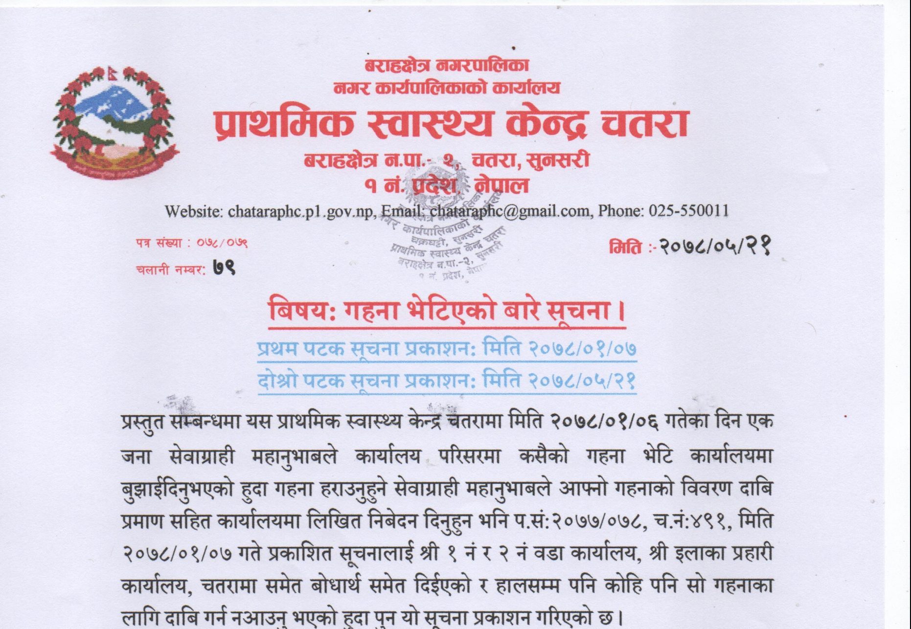 प्रस्तुत सम्बन्धमा यस प्राथमिक स्वास्थ्य केन्द्र चतरामा मिति २०७८/०१/०६ गतेका दिन एक जना सेवाग्राही महानुभाबले कार्यालय परिसरमा कसैको गहना भेटि कार्यालयमा बुझाईदिनुभएको हुदा गहना हराउनुहुने सेवाग्राही महानुभाबले आफ्नो गहनाको विवरण दाबि प्रमाण सहित कार्यालयमा लिखित निबेदन दिनुहुन भनि प.सं:२०७७/०७८, च.नं:४९१, मिति २०७८/०१/०७ गते प्रकाशित सूचनालाई श्री १ नं र २ नं वडा कार्यालय, श्री इलाका प्रहारी कार्यालय, चतरामा समेत बोधार्थ समेत दिईएको र हालसम्म पनि कोहि पनि सो गहनाका लागि दाबि गर्न नआउनु भएको हुदा पुन यो सूचना प्रकाशन गरिएको छ ।