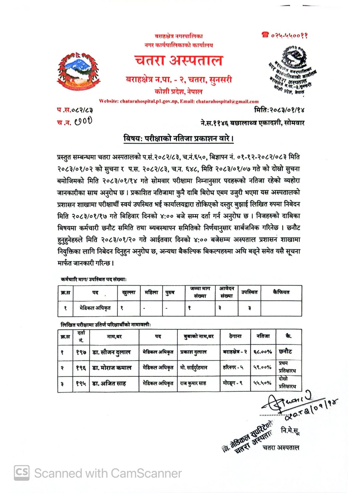 प्रस्तुत सम्बन्धमा चतरा अस्पतालको प.सं.२०८२/८३, च.नं.६५०, बिज्ञापन नं. ०१-१२-२०८२/०८३ मिति २०८३/०१/०२ को सुचना र प.स. २०८२/८३, च.न. ६४८, मिति २०८३/०१/०७ गते को दोस्रो सुचना बमोजिमको मिति २०८३/०१/१४ गते सोमवार परीक्षामा निम्नानुसार पदहरूको नतिजा रहेको व्यहोरा जानकारीका साथ अनुरोध छ । प्रकाशित नतिजामा कुनै दाबि बिरोध एबम उजुरी भएमा यस अस्पतालको प्रशासन शाखामा परीक्षार्थी स्वयं उपस्थित भई कार्यालयद्वारा तोकिएको दस्तुर बुझाई लिखित रुपमा निबेदन मिति २०८३/०१/१७ गते बिहिवार दिनको ४:०० बजे सम्म दर्ता गर्न अनुरोध छ । निजहरुको दाबिका बिषयमा कर्मचारी छनौट समिति तथा ब्यबस्थापन समितिको निर्णयानुसार सार्बजनिक गरिनेछ । छनौट हुनुहुनेहरुले मिति २०८३/०१/२० गते आईतवार दिनको ४:०० बजेसम्म अस्पताल प्रशासन शाखामा नियुक्तिका लागि निबेदन दिनुहुन अनुरोध छ, अन्यथा बैकल्पिक बिकल्पहरुमा अघि बढ्ने समेत यसै सूचना मार्फत जानकारी गरिन्छ ।