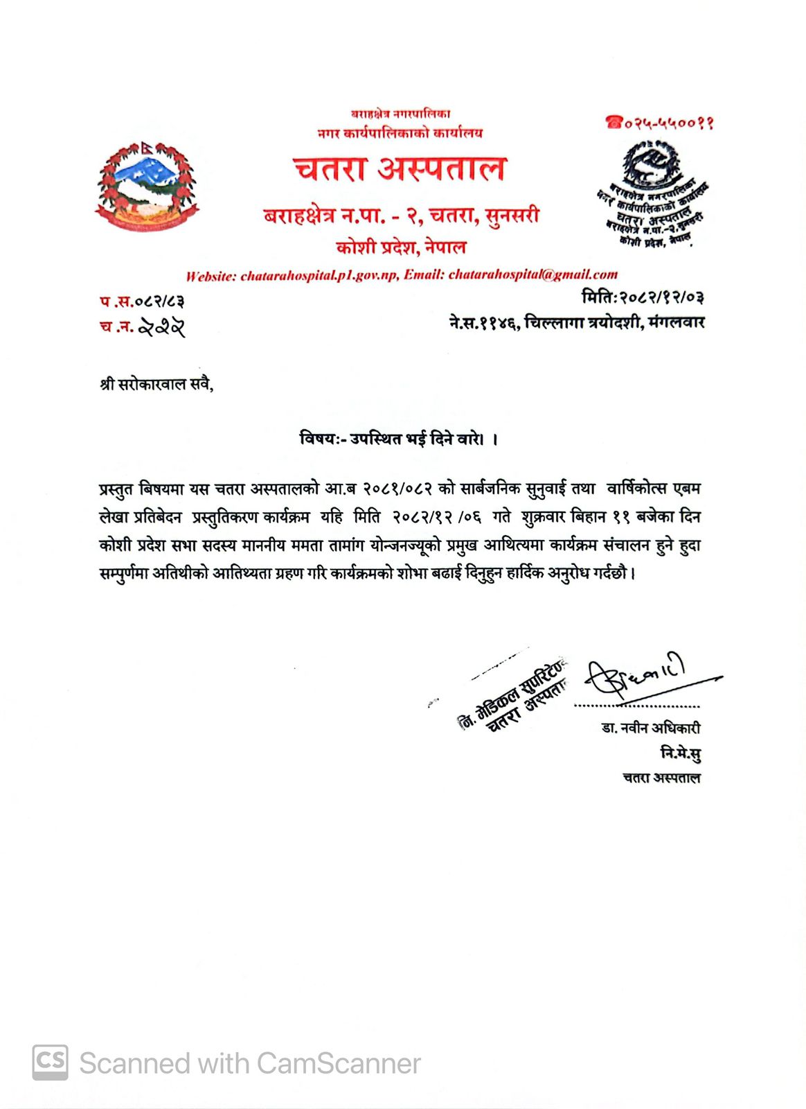 श्री सरोकारवाल सवैज्यू, विषयः- उपस्थित भई दिने वारे। । प्रस्तुत बिषयमा यस चतरा अस्पतालको आ.ब २०८१/०८२ को सार्बजनिक सुनुवाई तथा वार्षिकोत्स एबम लेखा प्रतिबेदन प्रस्तुतिकरण कार्यक्रम यहि मिति २०८२/१२ /०६ गते शुक्रवार बिहान ११ बजेका दिन कोशी प्रदेश सभा सदस्य माननीय ममता तामांग योन्जनज्यूको प्रमुख आथित्यमा कार्यक्रम संचालन हुने हुदा अतिथीको आतिथ्यता ग्रहण गरि कार्यक्रमको […]