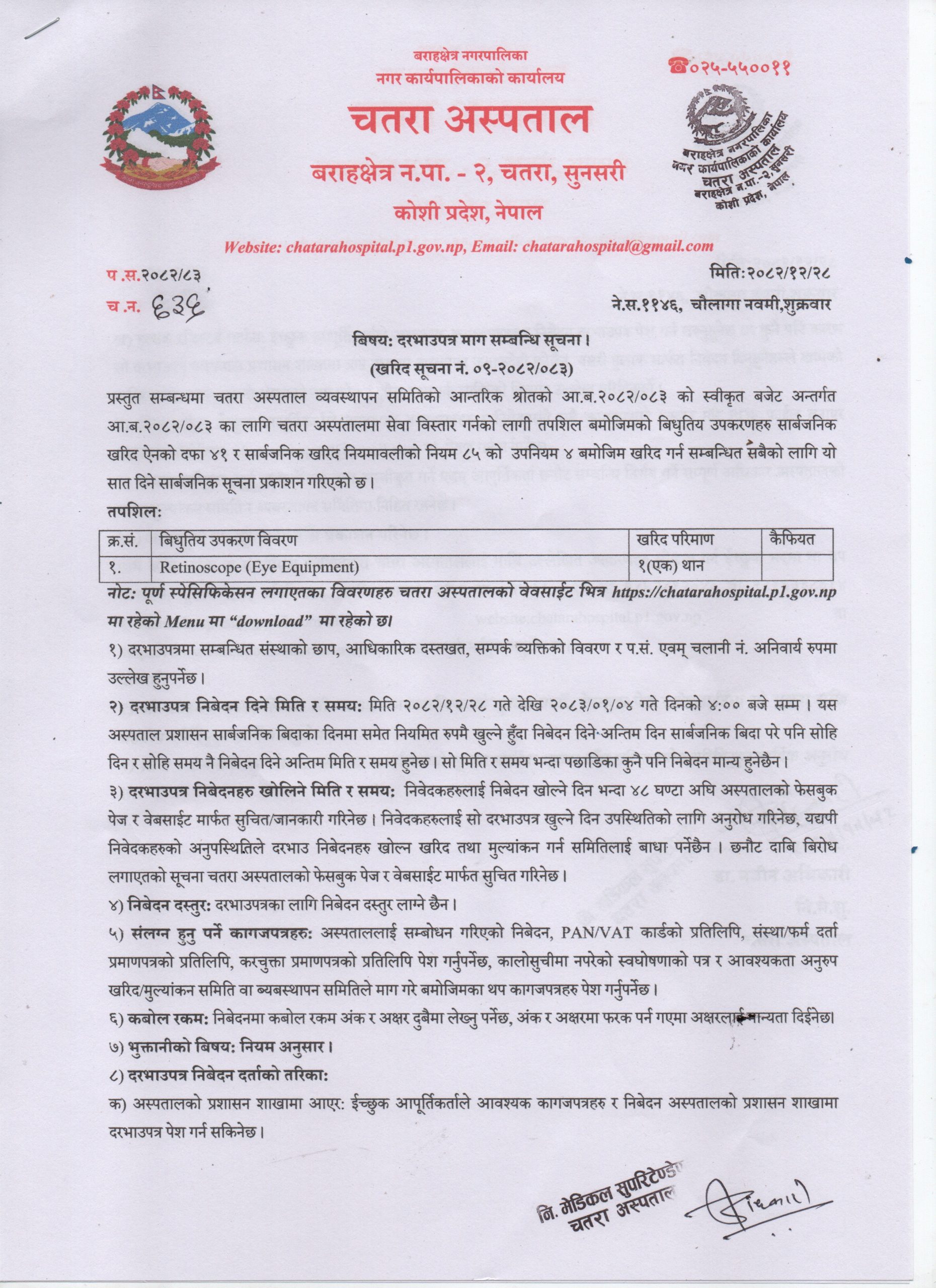 प्रस्तुत सम्बन्धमा चतरा अस्पताल व्यवस्थापन समितिको आन्तरिक श्रोतको आ.ब.२०८२/०८३ को स्वीकृत बजेट अन्तर्गत आ.ब.२०८२/०८३ का लागि चतरा अस्पतालमा सेवा विस्तार गर्नको लागी तपशिल बमोजिमको बिधुतिय उपकरणहरु सार्बजनिक खरिद ऐनको दफा ४१ र सार्बजनिक खरिद नियमावलीको नियम ८५ को उपनियम ४ बमोजिम खरिद गर्न सम्बन्धित सबैको लागि यो सात दिने सार्बजनिक सूचना प्रकाशन गरिएको छ । […]