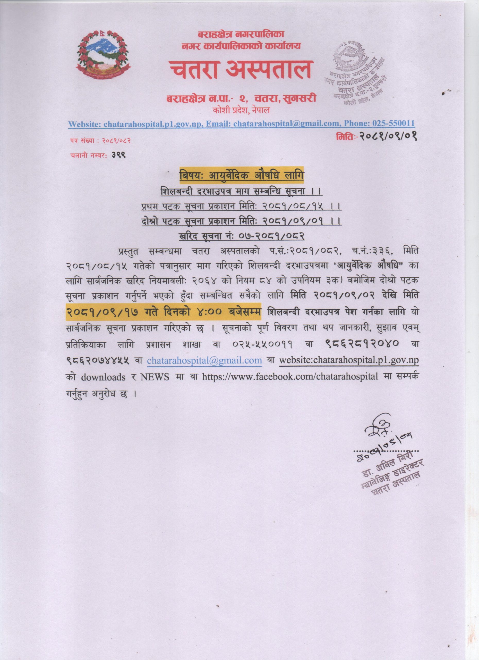 बिषय: आयुर्वेदिक औषधि लागि शिलबन्दी दरभाउपत्र माग सम्बन्धि सूचना ।। प्रथम पटक सूचना प्रकाशन मिति: २०८१/०८/१५ ।। दोश्रो पटक सूचना प्रकाशन मिति: २०८१/०९/०१ ।। खरिद सूचना नं: ०७-२०८१/०८२ प्रस्तुत सम्बन्धमा चतरा अस्पतालको प.सं.:२०८१/०८२, च.नं.:३३६, मिति २०८१/०८/१५ गतेको पत्रानुसार माग गरिएको शिलबन्दी दरभाउपत्रमा “आयुर्वेदिक औषधि” का लागि सार्बजनिक खरिद नियमावली: २०६४ को नियम ८४ को उपनियम […]
