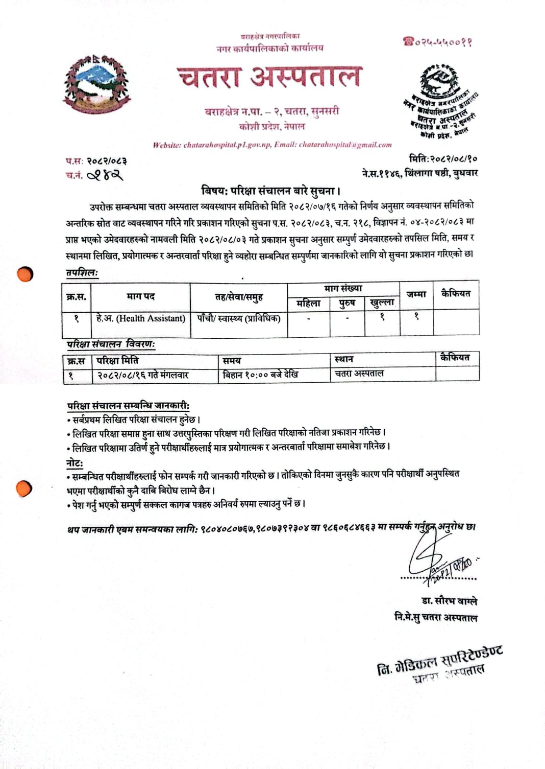 बिषय: परिक्षा संचालन बारे सुचना । उपरोक्त सम्बन्धमा चतरा अस्पताल व्यवस्थापन समितिको मिति २०८२/०७/१६ गतेको निर्णय अनुसार व्यवस्थापन समितिको अन्तरिक स्रोत वाट व्यवस्थापन गरिने गरि प्रकाशन गरिएको सुचना प.स. २०८२/०८३, च.न. २१८, विज्ञापन नं. ०४-२०८२/०८३ मा प्राप्त भएको उमेदवारहरुको नामवली मिति २०८२/०८/०३ गते प्रकाशन सुचना अनुसार सम्पुर्ण उमेदवारहरुको तपसिल मिति, समय र स्थानमा लिखित, प्रयोगात्मक […]