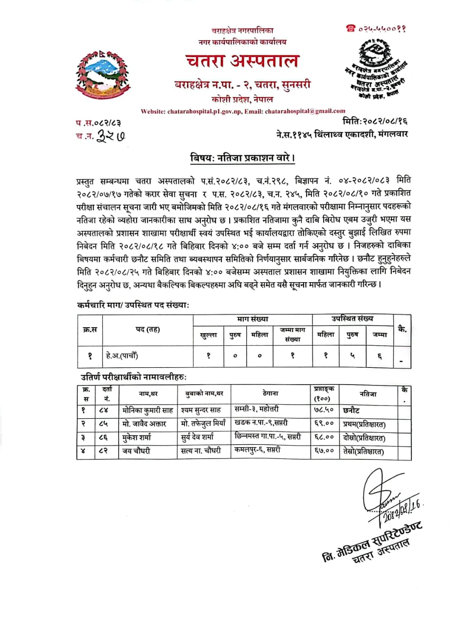 बिषयः नतिजा प्रकाशन वारे । प्रस्तुत सम्बन्धमा चतरा अस्पतालको प.सं.२०८२/८३, च.नं.२९८, बिज्ञापन नं. ०४-२०८२/०८३ मिति २०८२/०७/१७ गतेको करार सेवा सुचना र प.स. २०८२/८३, च.न. २४५, मिति २०८२/०८/१० गते प्रकाशित परीक्षा संचालन सूचना जारी भए बमोजिमको मिति २०८२/०८/१६ गते मंगलवारको परीक्षामा निम्नानुसार पदहरूको नतिजा रहेको व्यहोरा जानकारीका साथ अनुरोध छ । प्रकाशित नतिजामा कुनै दाबि बिरोध […]