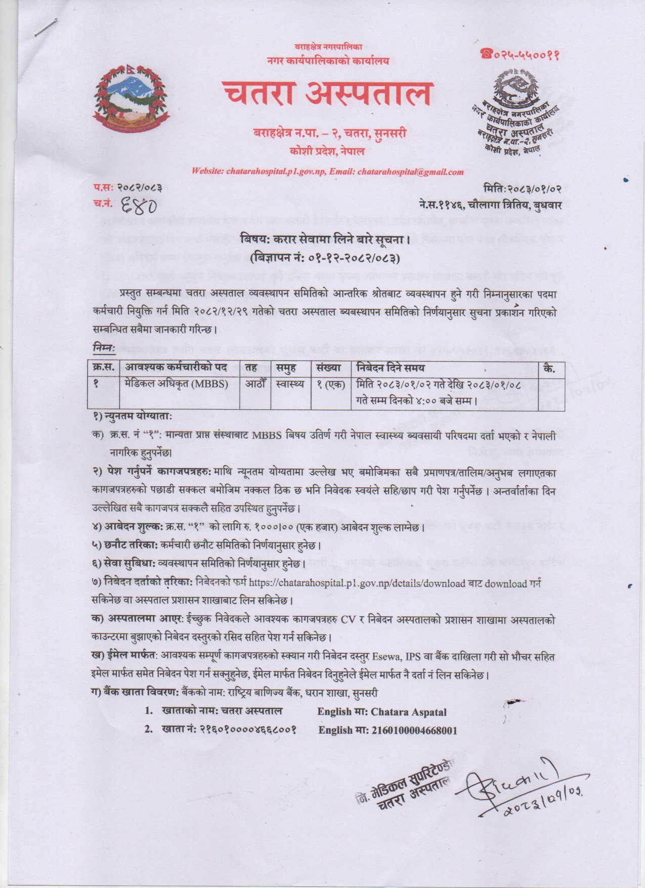 बिषय: करार सेवामा लिने बारे सूचना । बिज्ञापन नं: ०६-२०८२/०८३ प्रस्तुत सम्बन्धमा चतरा अस्पताल व्यवस्थापन समितिको आन्तरिक श्रोतबाट व्यवस्थापन हुने गरी निम्नानुसारका पदमा कर्मचारी नियुक्ति गर्न मिति २०८२/०८/२२ गतेको चतरा अस्पताल ब्यबस्थापन समितिको निर्णयानुसार सुचना प्रकाशन गरिएको सम्बन्धित सबैमा जानकारी गरिन्छ । निम्न क्र.स. आवश्यक कर्मचारीको पद तह समुह संख्या निबेदन दिने समय […]